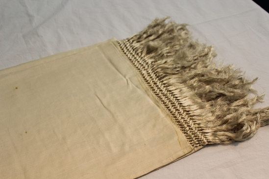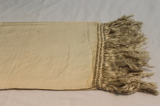 Long cream colored silk shawl; knotted design with fringe at two ends