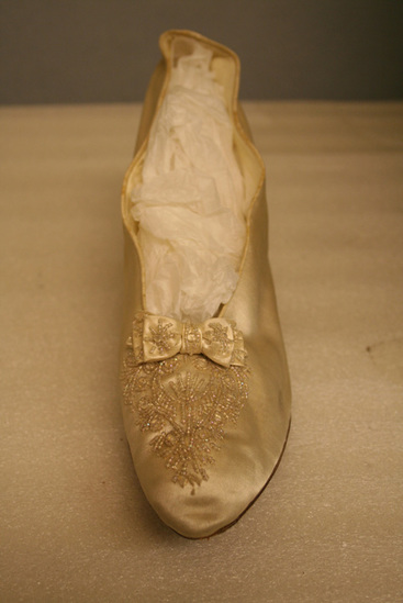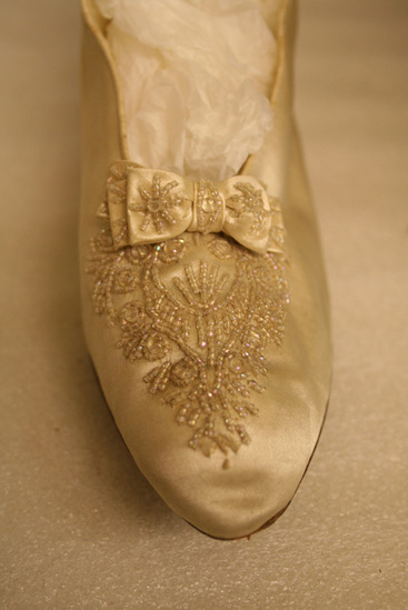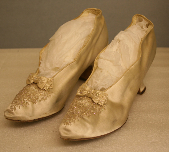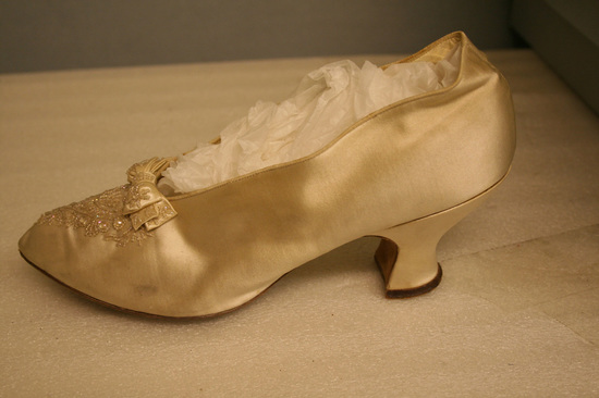 Cream silk women's shoes, 2" heel, rounded and pointed toe. Toe elevated upwards off of floor. Top of toe covered with beaded design. Three layered bow sits at shoe opening. Body of shoe is tall - would come up high on a woman's foot and ankle. Maker's stamp on inside of shoe but too worn away to read. Wooden sole with brass screw in bottom of heel.