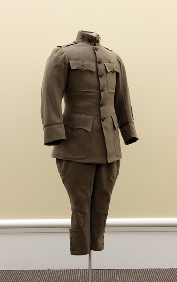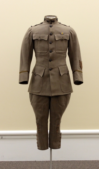 Olive drab wool breeches; button fly with hook & eye at waist; no waist band; buttons for suspenders on outside; watch pocket with flap on right side; slit pockets in side seams; back has built in belt with buckle; two pockets with buttons; reinforced inner thighs; breeches have full, wide thighs; material tight along legs from knees down; four buttons along bottom of pants; label on belt "Giombino Marseille 20 Rue St. Feireol ous Ruff or Buff 622-29-8 1918"