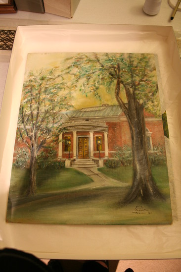 Front entrance of Noyes Memorial Building (LHS) perspective curiously foreshortened two trees appeared in foreground or may have been painted from a photograph. Shows skylight on roof. Sky yellow, insubstantial tree trunks in dry brush, foliage patted on with edge of brush. Foliage and grass unrealistic gray-green. Traces of gilt tape having been applied at edge.