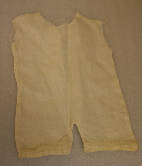 Doll's combination - white muslin, neck, arm holes and back plackut unhemmed. Legs hemmed with elastic tape at knee.