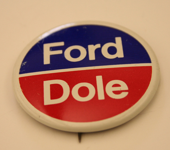 Round metal pin-back button with straight pin on back. White rim with top half blue, bottom half red with white line dividing two colors. In white lettering in blue "Ford" and in red area "Dole"