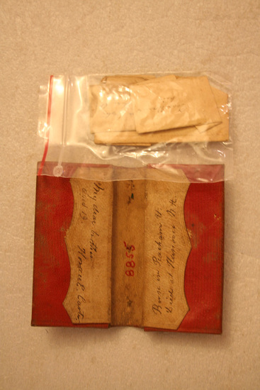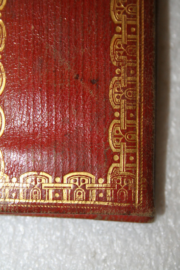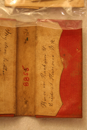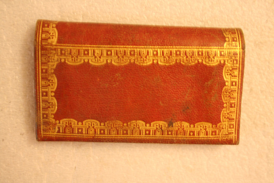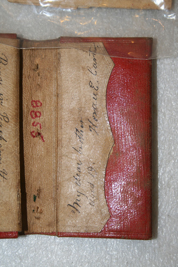 Red leather bi-fold wallet with two interior pockets. Top and bottom pocket each have additional pocket with flap over it. Inking writing on flaps "My dear brother/aged 19. Horace E. Carter" and "Born in Peacham VT/ Died at Hanover N.H." Wallet embossed with gold pattern on exterior.