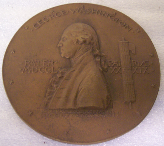 Brown cardboard box with blue silk lining, top in gold letters on cover "The Washington Centennial Medal 1889", at bottom "Authorized by the Committee designed by A. St. Gaudens" Bronze medal, smooth edged, smooth rim, matte finish. 13 stars around edge. "George Washington" at top. In center is a left facing bust profile with faces at left, "PATER PATRIAE/MCDDLXXXIX" across middle. On back side 38 stars around reverse, eagle with shield and motto at top, city of New York shield at lower left. Inscription "TO COMMEMORATE/THE INAUGURATION/OF GEORGE WASHINGTON AS FIRST PRESIDENT OF THE/UNITED STATES OF AMERICA/AT NEW YORK APRIL XXX/MDCCLXXXIX/BY AUTHORITY OF THE COMMITTEE/ON CELEBRATION/NEW YORK APRIL/XXX/MDCCLXXXIX"