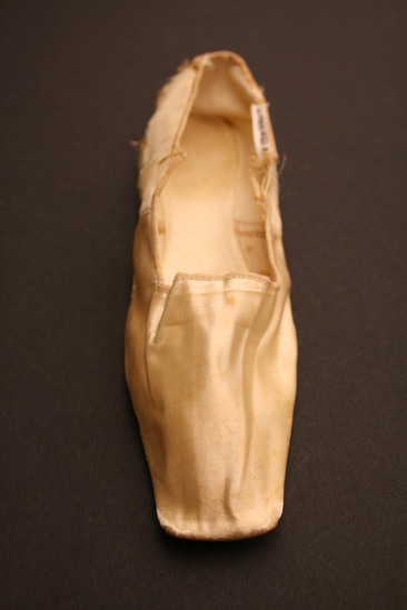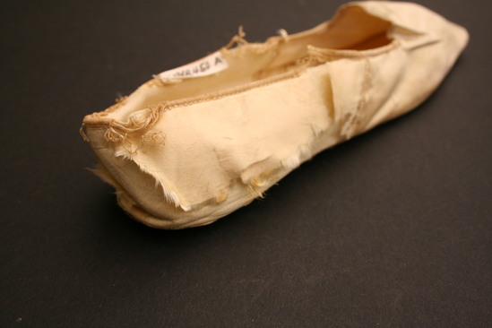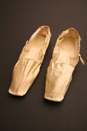 White silk slippers, square toes, ties have been cut off; leather soles; flat ballet style, no heels; interior lined with linen and white leather