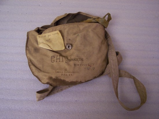 Cloth bag with long shoulder strap. Flap closure with button clasp. Written in ink on front of bag "G.H. Richards/New York City/USA/Convois Automobiles/S.S.U. 67" Gas mask inside bag