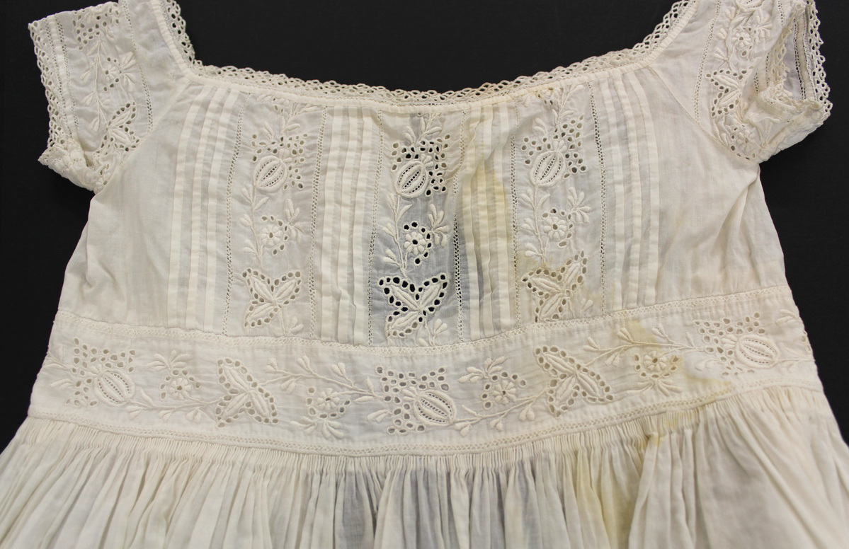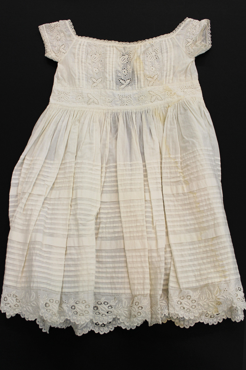 White cotton child's dress; scoop neckline; short embroidered sleeves; embroidered waistband; gathered skirt; gathered back bodice; front bodice eyelet with embroidery; skirt with tucks and embroidery at hem; drawstrings at neck and waist with two thread buttons and loops