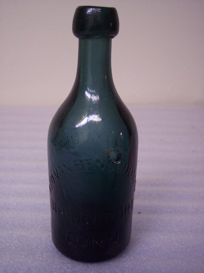 Green glass bottle. Short neck with pronounced lip around opening. Impressed on one side "Geo. Van Benschoten/Bridgeport, Conn" On other side "PREMIUM SODA WATER"