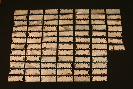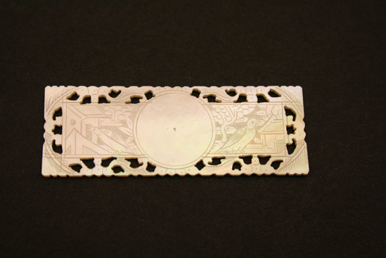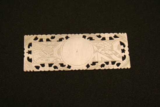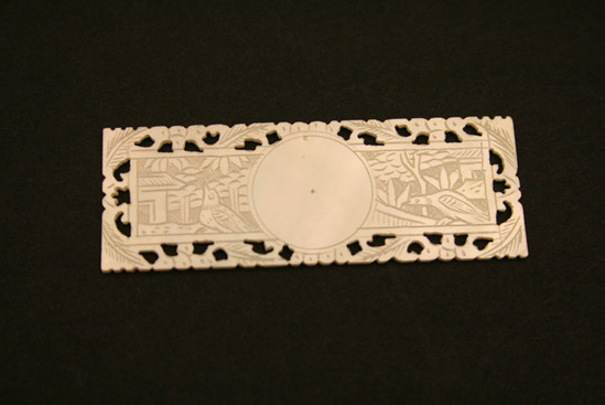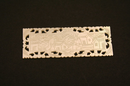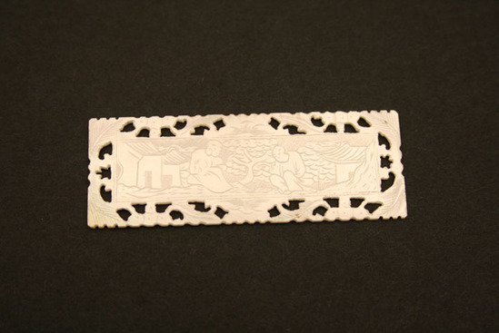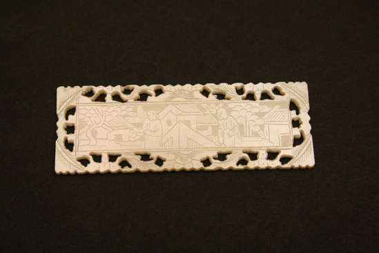 79 game counting pieces. Rectangular shape with pierced border; scene on one side of two Asian men, houses in background; design varies from counter to counter; backside has circle in center with landscape scene on either side usually with bird or two, houses and trees - again design varies