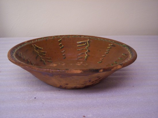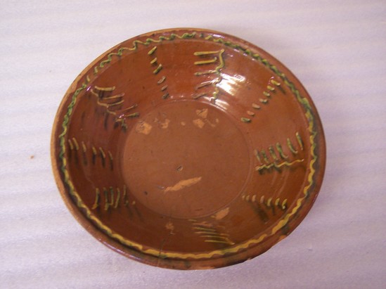 CLEAR GLAZED INTERIOR WITH YELLOW AND GREEN SLIP LINE DESIGNS. ROLLED, RIM, PLAIN BASE, SLOPING SIDES.