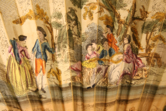 Fan with white wooden sticks on bottom half of frame and carved brown wooden sticks at top half of frame. Body of fan made of paper. Cut along top in intricate pattern. Watercolor scene of musicians, dancers - possibly hand painted.