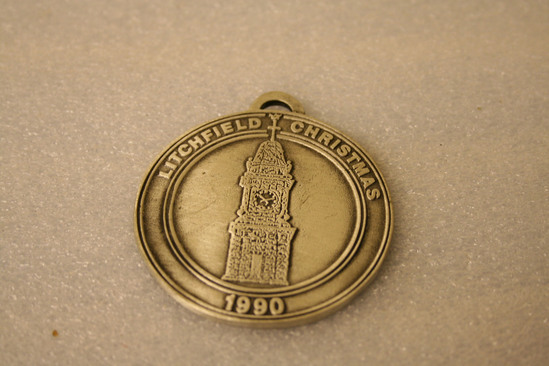 Pewter Christmas ornament, flat circle, with raised image of the clock tower of the Litchfield Court House. Around outside, "Litchfield Christmas/ 1990." Commissioned from Woodbury Pewter, Woodbury, Ct. by the Litchfield Recreation Department as a fundraiser.