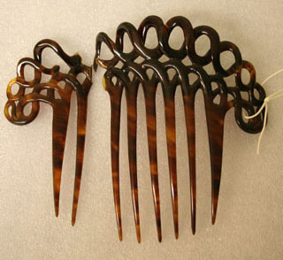 Tortoise shell woman's hair comb. Eight teeth tapering from center to ends with longest teeth in center. Ridge of comb consists of twisted or coiled design..