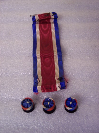 A-C: three rosettes, similar to cufflinks. Round with center made of blue silk ribbon gathered in center with white thread and then fanned out to fill entire center. Border of red, white and blue striped ribbon. Back of rosette has metal desk impressed with "U.S. Patent 1888 France" D: Length of blue, white and red silk ribbon, ends frayed