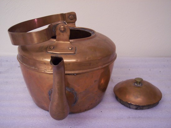 Slightly flared round body with crimped shoulder, straight to domed top with flared domed cover with mushroom brass finial. Elbow spout with split opening. Flat edged two nail handle holders with strap handle in mushroom form.