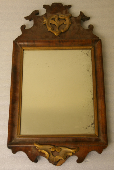 Oblong mirror frame of wood with thin layer of gilt band and old style glass; crest of same wood articulated and carved with old repairs, and gesso rococco ornament in form of simple foliage in cartouche. Crest 6 1/4" high, bottom simple carved base with winged gesso ornament - loose held in place with two nails. Simple pine backing with modern attachments. Modern screw eye removed.