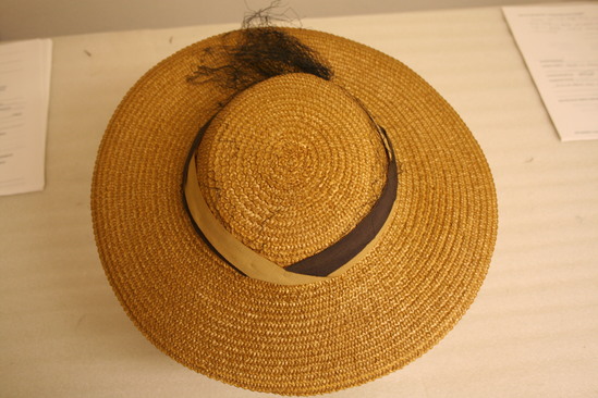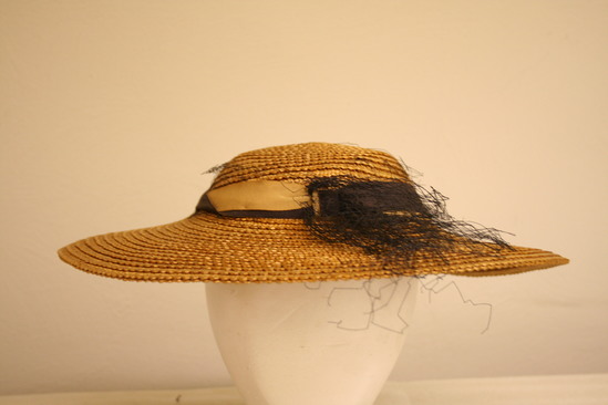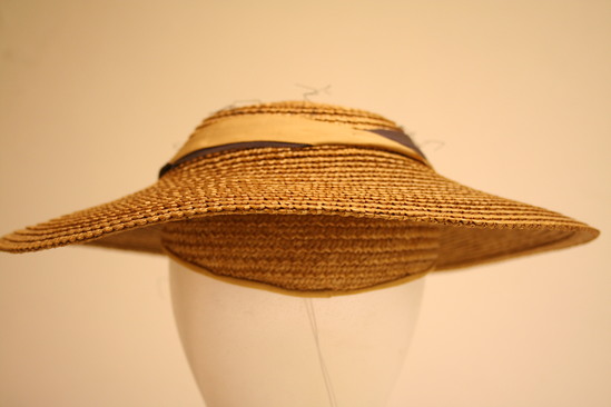 Shallow, circular straw hat with straw band in back under brim; crown trimmed with purple and beige ribbon; center of front is large stringy decoration