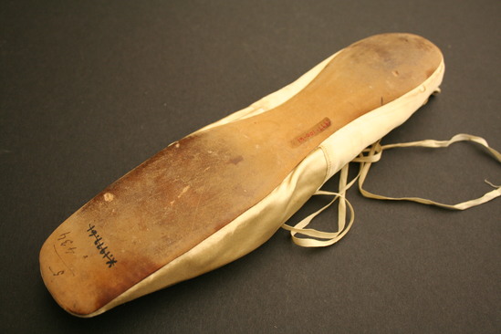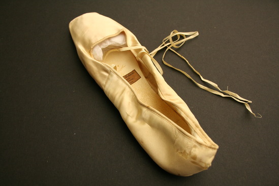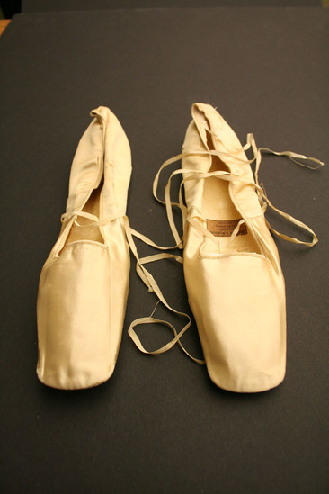 White silk slippers with white silk ties; brown leather soles. Inner soles marked "gauche" and "droit" Square toes, flat heels. Maker's label "Middleton & Ryckman, Makers, 327 Broadway, New-York" on right inner sole