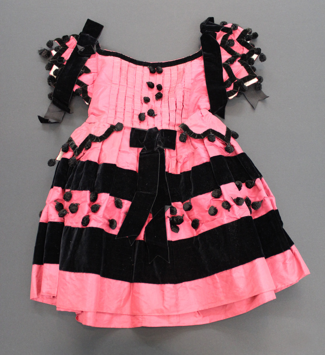 Pink silk taffeta child's dress; off-the-shoulder neckline; black velvet pom poms and trim on sleeves and skirt; short scalloped double sleeves; full skirt with peplum; satin bows at shoulders and center front skirt; pleats on front and back bodice; center back opening with hooks and eyes; skirt lined with crinoline
