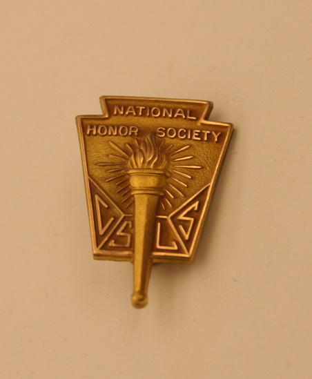 Small gold pin, torch in center which extends past bottom of pin, across top "National/Honor Society" Pin trapizodial shape with top having raised piece in center.