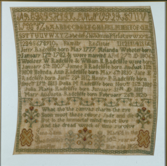 Framed sampler, natural linen canvas with green cross-stitch sentiments and designs, blue thread Greek key border, several sets of the alphabetm and numbers. Family register of the Radcliffe family from 1777 to 1822, Signed Jane Ellen Radcliffe 10th year of her age 1822.