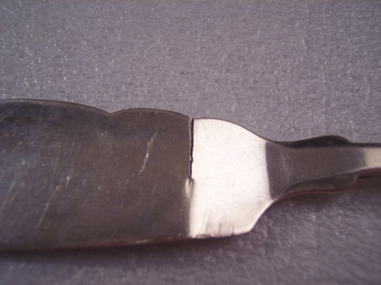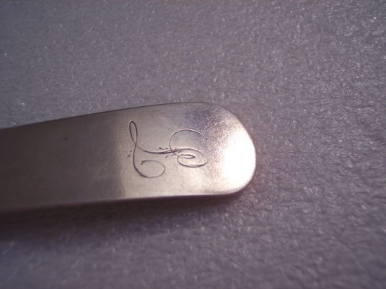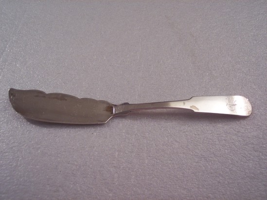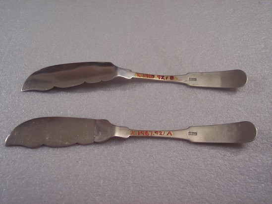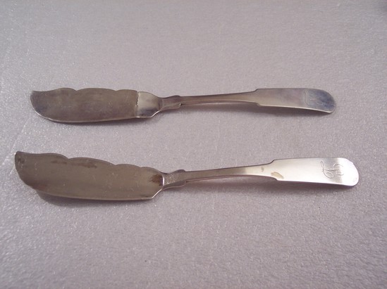 Pair of silver butter knives. Ensko 1810 style handle, one side of wide flat blade, the other side is rounded with 1 semi curved and 3 flat arcs near handle. Engraved with letter "L" for Lord family. Hallmarked "RM" in serrated rectangle.