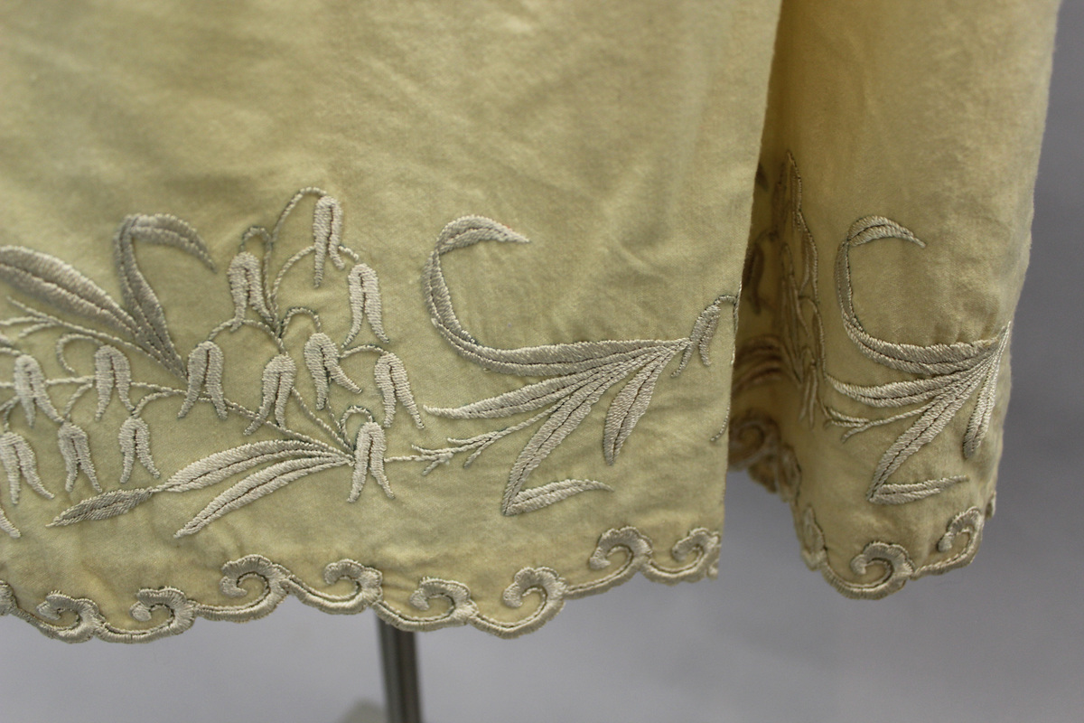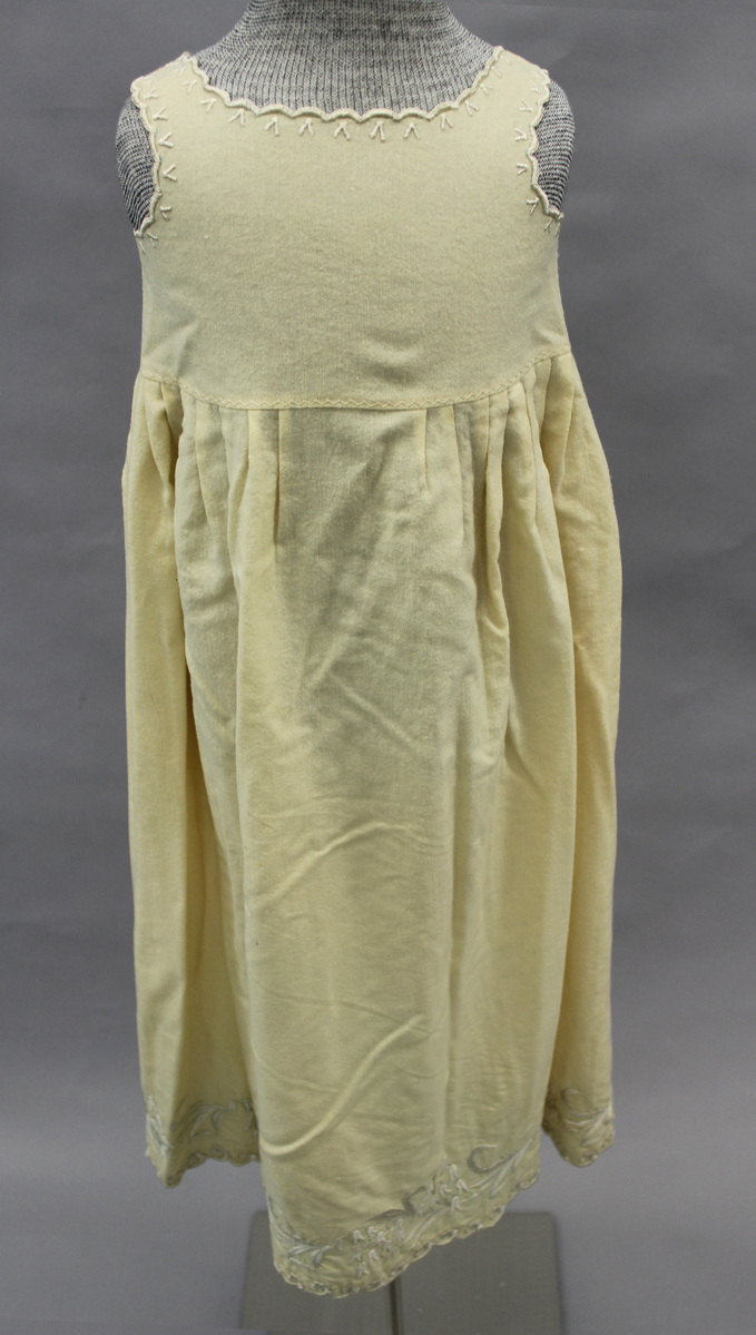 Cream-colored wool child's full slip; boatneck; sleeveless; embroidery at neck and front placket of bodice, armholes and hem; four mother-of-pearl buttons at center front for closure