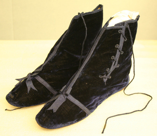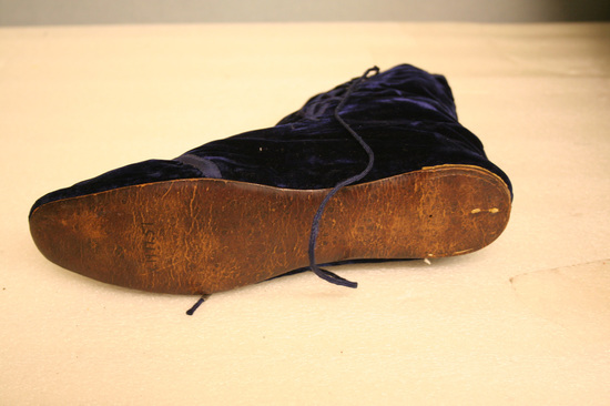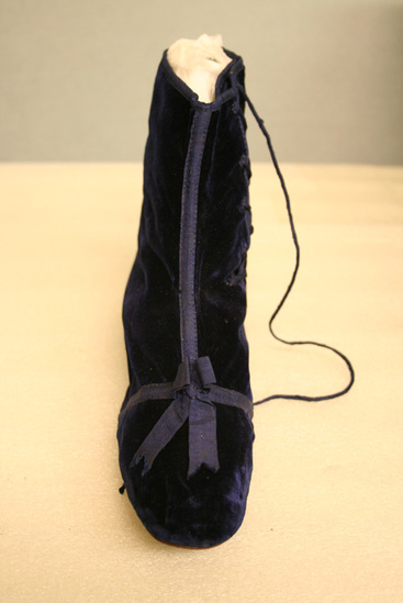 Dark blue velvet ankle high shoes that lace up sides; blue satin bows on front with blue satin trim; white cloth lining; brown leather sole with round toe