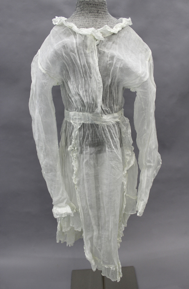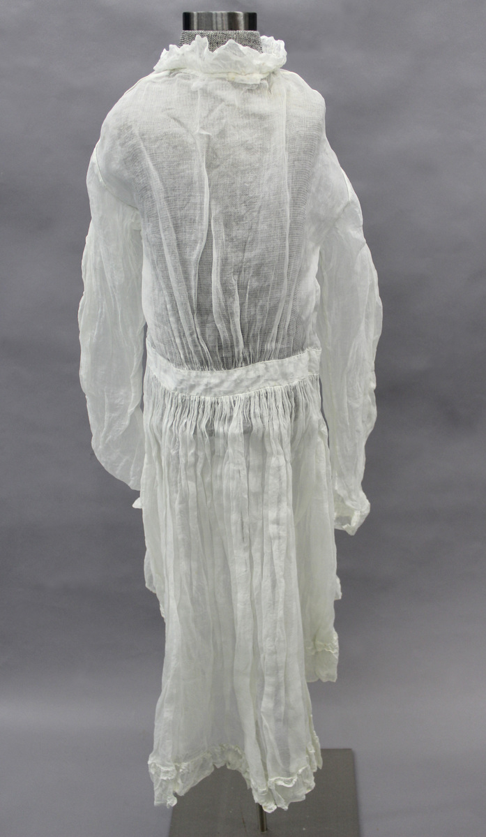 White sheer cotton child's overdress; long sleeves with double ruffle cuffs; piping around armholes; round neck with double ruffle; skirt front panel with double ruffle; skirt back forms a train; waistband; center front opening with no closures