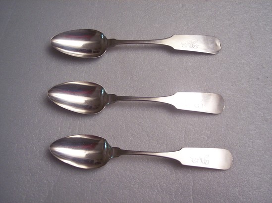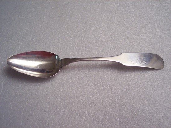 Large silver table spoon, Ensko shape 1810. No tab joint. Engraved on handle "AC" in script. Hallmarked on back of handle "F.OAKES" and "HARTFORD" in separete serrated rectangles