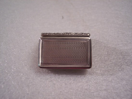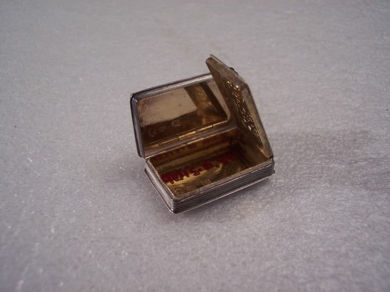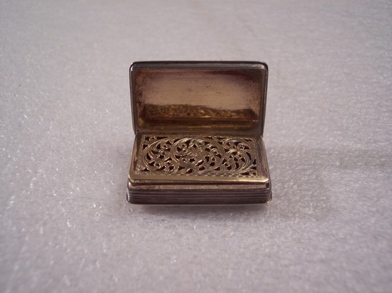 Oblong box with hinged cover - interior pierced cover with rococo floral design opens from side. Interior gold wash. Sides horizontally grooved and flared in bottom with zig-zag design, top rim rococo casting, zig-zag with oblong for initials Hallmarks on bottom of box, anchor in shield/ "JL" in box/ H in sheild in top/Oval with head in profile, "JL" and lion in profile in square