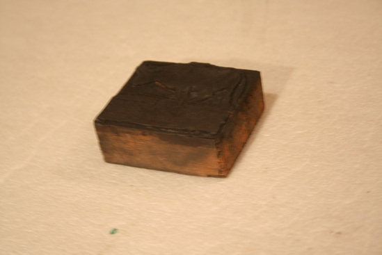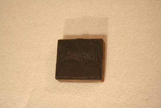 Stamp with wooden base; raised stamp on one side of a steer standing on small, square block. Stamp made of rubber like material. Nailed to wooden block
