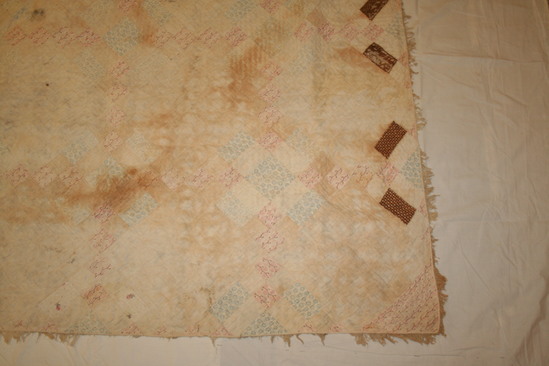 This quilt was found in the basement of the Noyes Memorial Building in 1955 in a trunk after a flood.