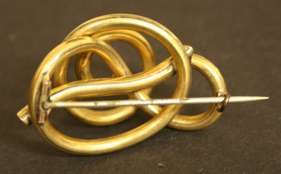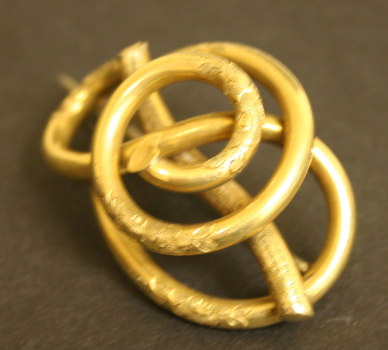 Brooch of gold tubing that has been twisted and looped around. Floral pattern brightcut onto certain areas of tubing. Stick pin visible on back.