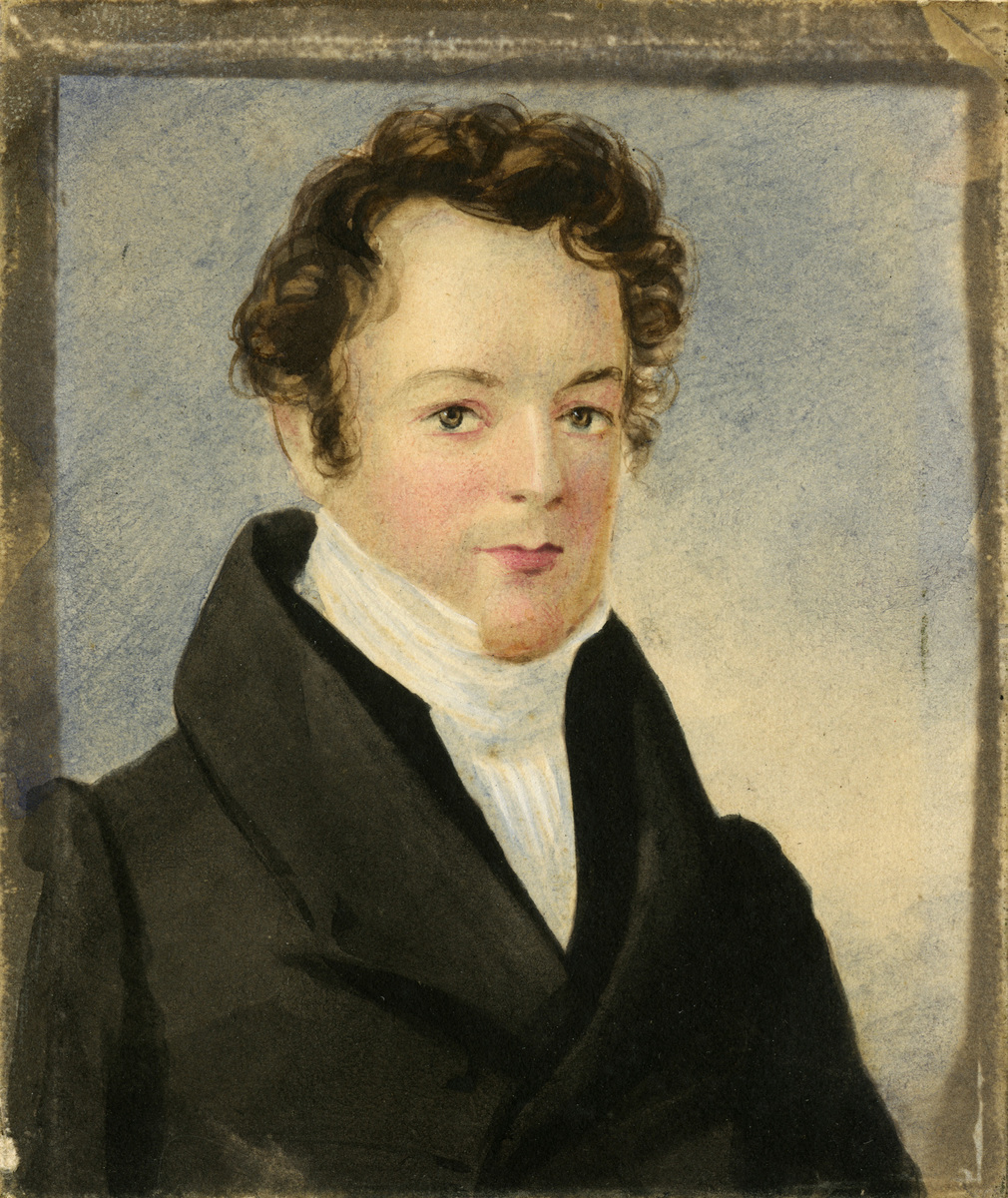 Watercolor on paper, blue background. Figure has brown curly hair, brown eyes, black coat and white shirt. Almost full-face, bust length. Originally framed in black wood frame, under daguerreotype preserver, glass, and mat.