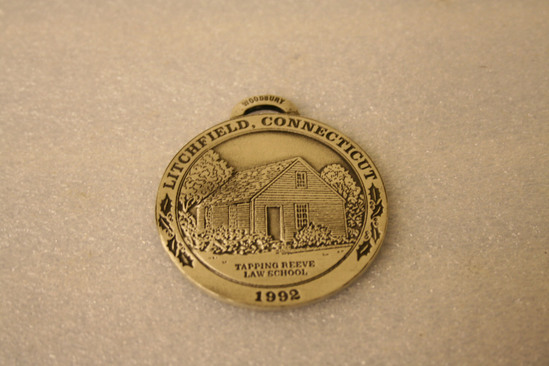 Pewter Christmas ornament, flat round with raised image of the "Tapping Reeve Law School" with that inscription below. Around outside: "Litchfield, Connecticut/ 1992." Commissioned by the Litchfield Recreation Department from Woodbury Pewter as an annual fundraiser.
