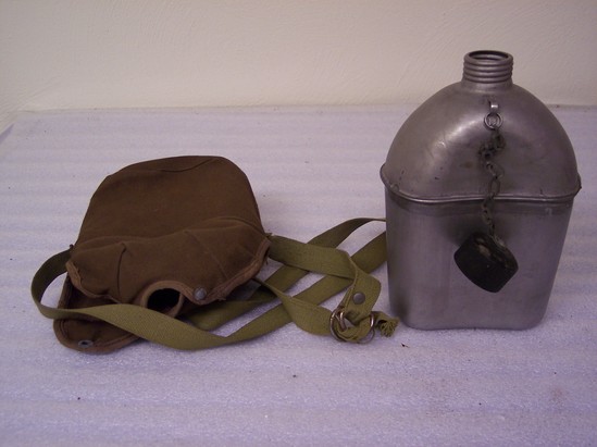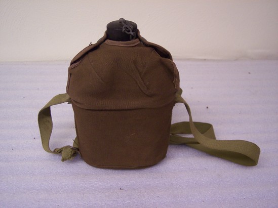 A: metal canteen with plastic screw on top connected with metal chain. Canteen soldered at shoulder. Has round top, straight sides. B: Brown cotton case has metal snaps to fit over shoulder of canteen so that it can be held on. Olive green carrying strap sewn to case just below hole for canteen. Strap is adjustable with two metal loops. Case has center seam down one side and bottom is also sewn on.