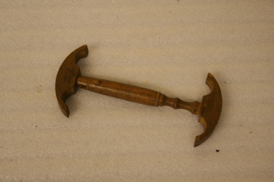 Wooden hat stretcher. Shaped like the letter "I" Each end is rounded. Center rod is turned. One end swivels on a wood screw and can be tightened or loosened depending on the size of the hat