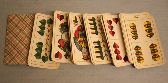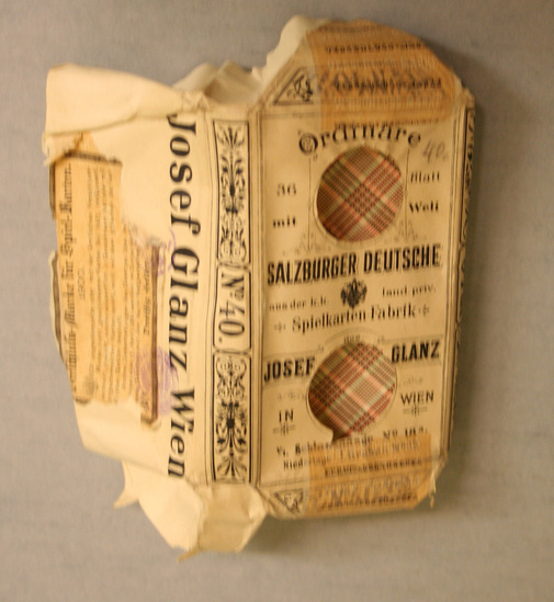 Deck of 36 cards divided into 4 suits by symbol - leaf, bell, heart, acorn. Back side of card had red and green plaid design. Paper wrapper with maker's name "Josef Glanz" and other German writing.