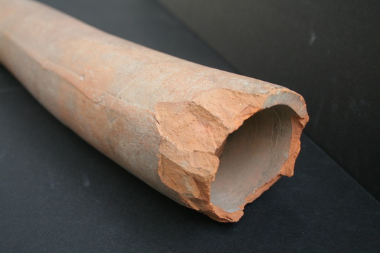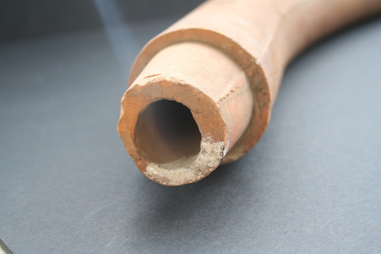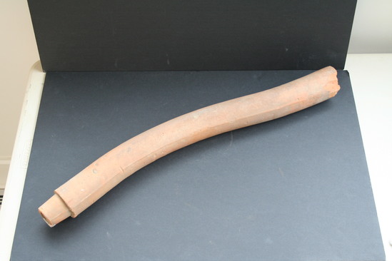 UNGLAZED PIPE, CURVED. ONE END BROKEN, ONE END TAPERS TO FIT INTO OTHER PIPES.