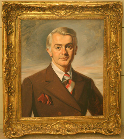 Oil on canvas. Self portrait of artist. Painting of head and upper torso. Gray/silver hair and brown eyes. He is wearing a brown sports coat with a white shirt and white, red and brown diagonally stripped tie. He has a red pocket square. The background is swirls of blue and grey with a little peach. Ornate gold frame, heavily carved. Sticker on back of frame "The House of Heydenryk/417 E. 76th St./New York, NY 10021"
