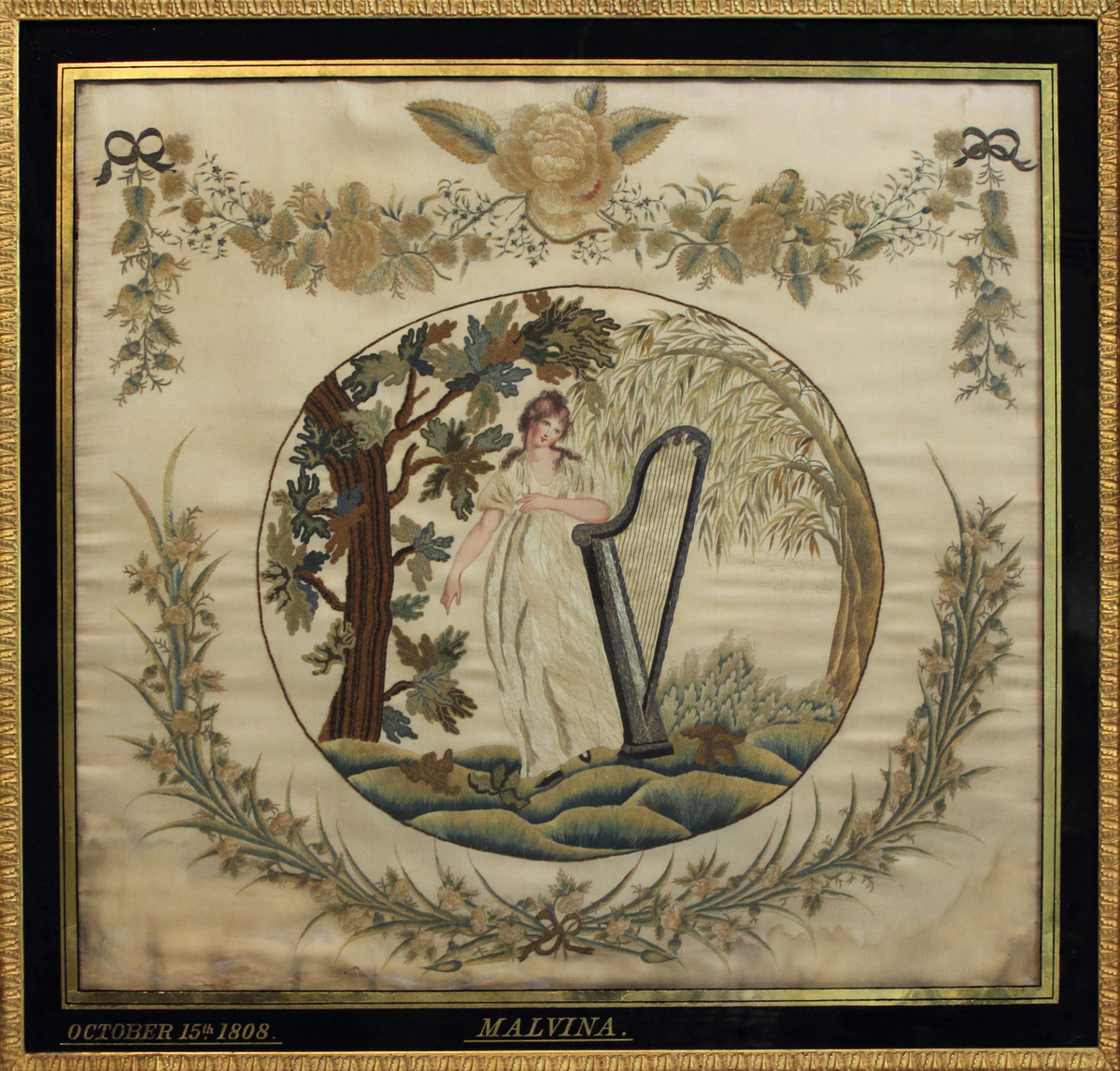 Female figure standing on hill, leaning on a harp. She wears a loose-flowing garment, 3/4-length sleeves. Based on character from Poems of Ossian. The body of the embroidery is done in a circle on white silk. Around the outside of the circle are swags of leaves and flowers in golds and greens with a large flower at the center top of the embroidery picture. Framed under glass with eglomise or reverse painting on glass of black and gold border. Printed in gold lettering along bottom "October 15, 1808" and "Malvina".