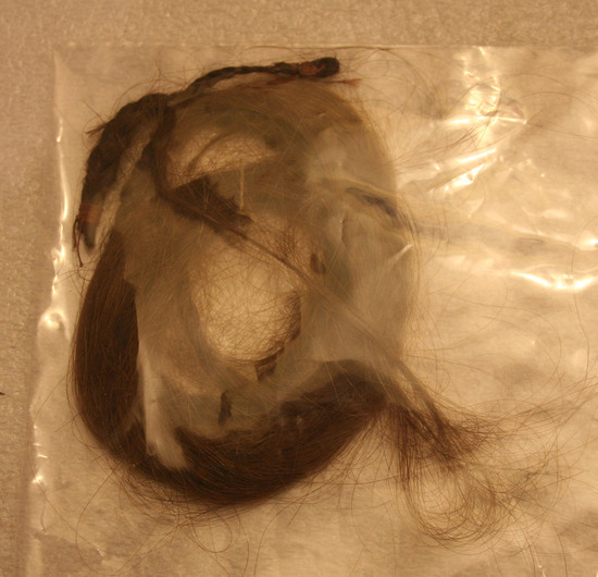 A - 3 braids of hair, all brown, braided and twisted into a pretzel shape. Attached to piece of paper with sealing wax. Written at bottom in ink, "My earthly all. My Rhoda and my child/When will the morning come. Milo Beach" B - Clump of hair, each end partially braided and tied with brown thread.
