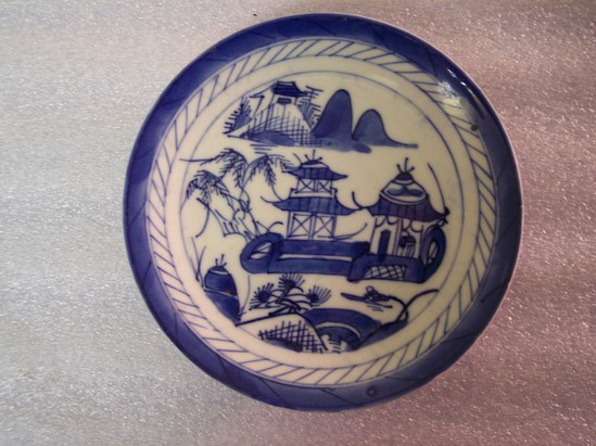 White saucer is footed. Blue and white decoration depicting two buildings, a bridge, a tree, and mountains. Wide blue band around the edge.