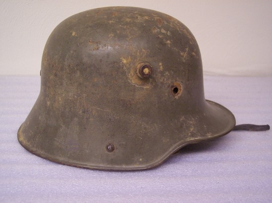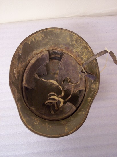German helmet - steel, painted light olive green color. Interior of helmet has leather chin strap wit metal buckle and leather sweatband around circumferance of the helmet. Flaps attached to sweatband and tied together with cloth string.