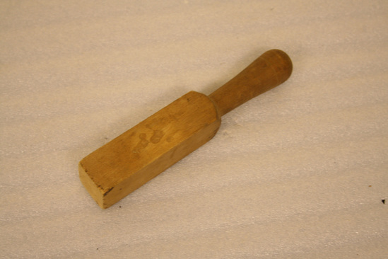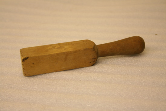 Single piece of wood. Top half block shape with sharp corners at end. Bottom half rounded at end and carved down to the shape of a handle.