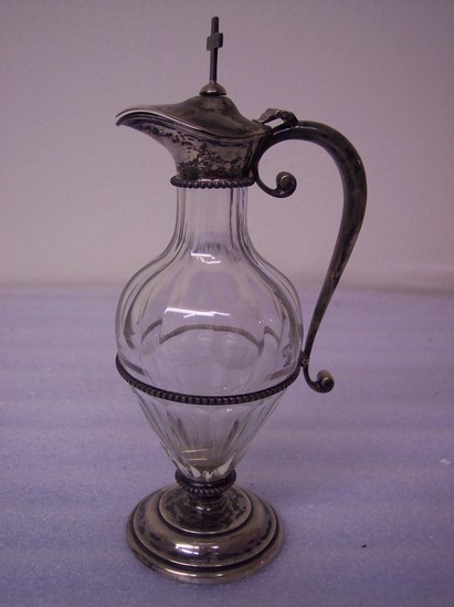 Stepped round silver base with stem having dot ring to hold flared paneled glass body with tapering upper part - cut glass. Silver pourning spout, double cyma handle attached to body of glass with dotted band. Domed fitted spout lid with cross.