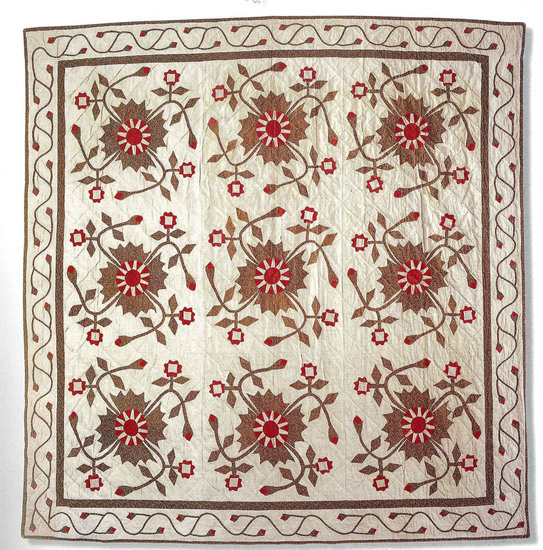 Appliqued quilt with "Rose of Sharon" or "Whig Rose" design at center and Rosebud design border on white cotton ground. Large repeats of red and white flowers surrounded with leaves and each with four angular branches pin wheeling around. The patterns are printed calicoes - predominately green, then red and a white one with yellow design. The calicoes were cut out and appliqued to the ground, then cotton batting and backing of cotton, hand quilted all over.