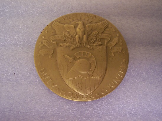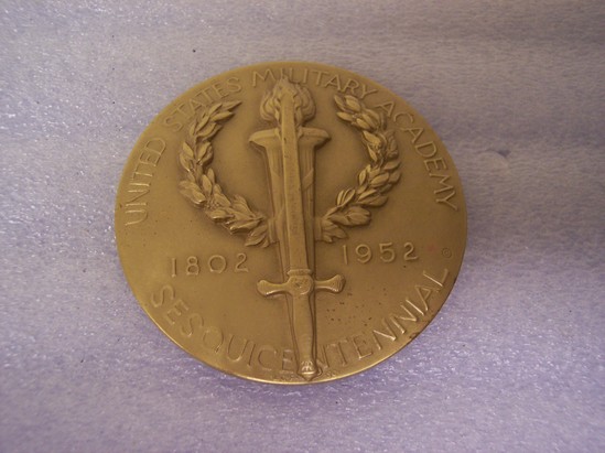 Fat bronze medal with smooth rims. On front of medal image of sword, torch and laurel wreath. Inscribed around sides "UNITED STATES MILITARY ACADEMY SESQUICENTENNIAL, 1802-1852" and on back of medal image of shield of West Point with "West Point" above and "DUTY HONOR COUNTRY" below