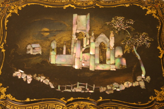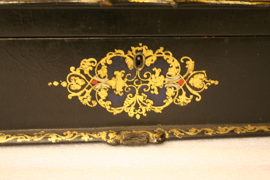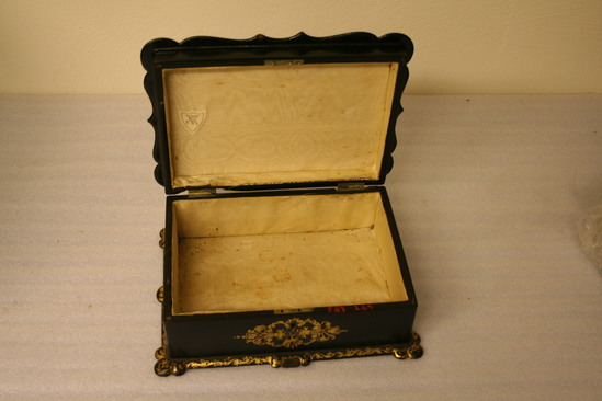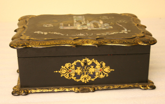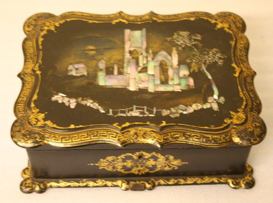 Work box - wood painted with black laquer. Interior lined with white silk. Hinged lid. Sculpted lid and bottom of box with rounded protruding corners. Gold leaf painting around bottom and around key hole on front of box. Lid has castel like building in mother of pearl with stone fence and tree. Moon and key painted in oil. Border around outside in gold leaf with touches of red oil paint.